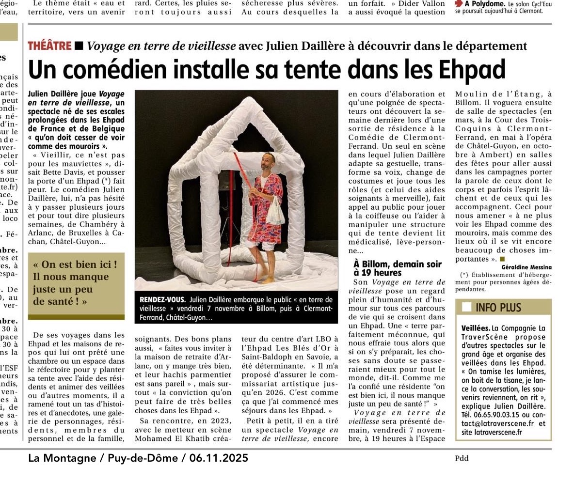 Julien Daillère est auteur, comédien, metteur en scène. Avec la compagnie La TraverScène, il intervient régulièrement en EHPAD, notamment en Unités Protégées, dans la cadre du commissariat artistique du Centre d’art LBO à l’EHPAD Les Blés d’Or de St-Baldoph, associé à Malraux scène nationale Chambéry Savoie, ou bien en tant qu’artiste dans le cadre de projets de territoire dans le Puy-de-Dôme, comme avec Le Caméléon à Pont-du-Château (2024) ou le SMAD des Combrailles (2025). Ce cycle de recherche-création s’inscrit dans le cadre de la conception du spectacle Voyage en terre de vieillesse qui sera créé en novembre 2025 à Billom puis en tournée.